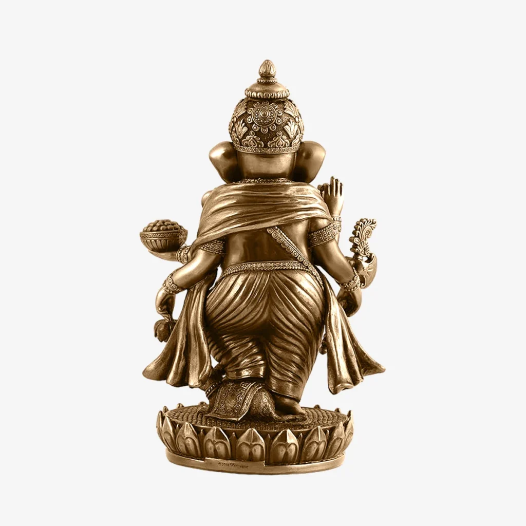 Ganesha idol adorned with detailed ornaments, including a richly decorated crown, traditional jewelry, and sacred threads. The base of the idol is lotus-shaped, signifying purity and spiritual enlightenment. The intricate craftsmanship on the body and facial expressions reflects divine grace and the remover of obstacles aspect of Lord Ganesha.